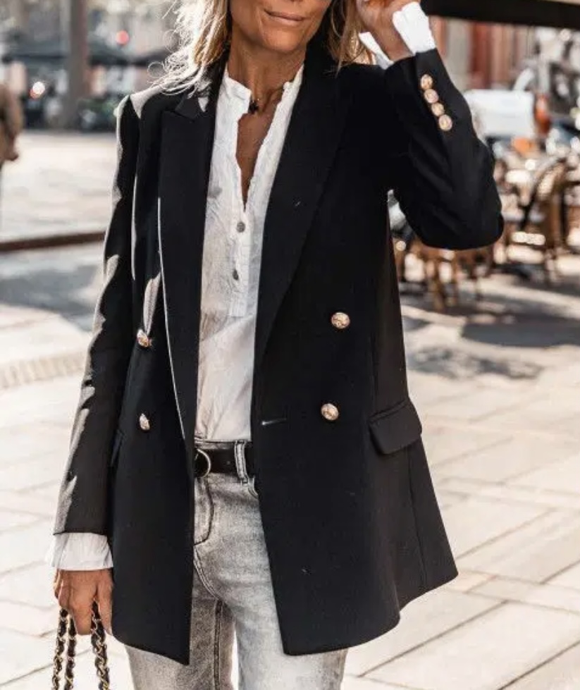 Blazer elegante y sofisticado, ideal para cualquier ocasión. Diseñado en color negro clásico, cuenta con doble botonadura en tono oro viejo y un botón interior que permite un cierre perfecto. Incluye hombreras para una estructura estilizada y forro interior para mayor comodidad.