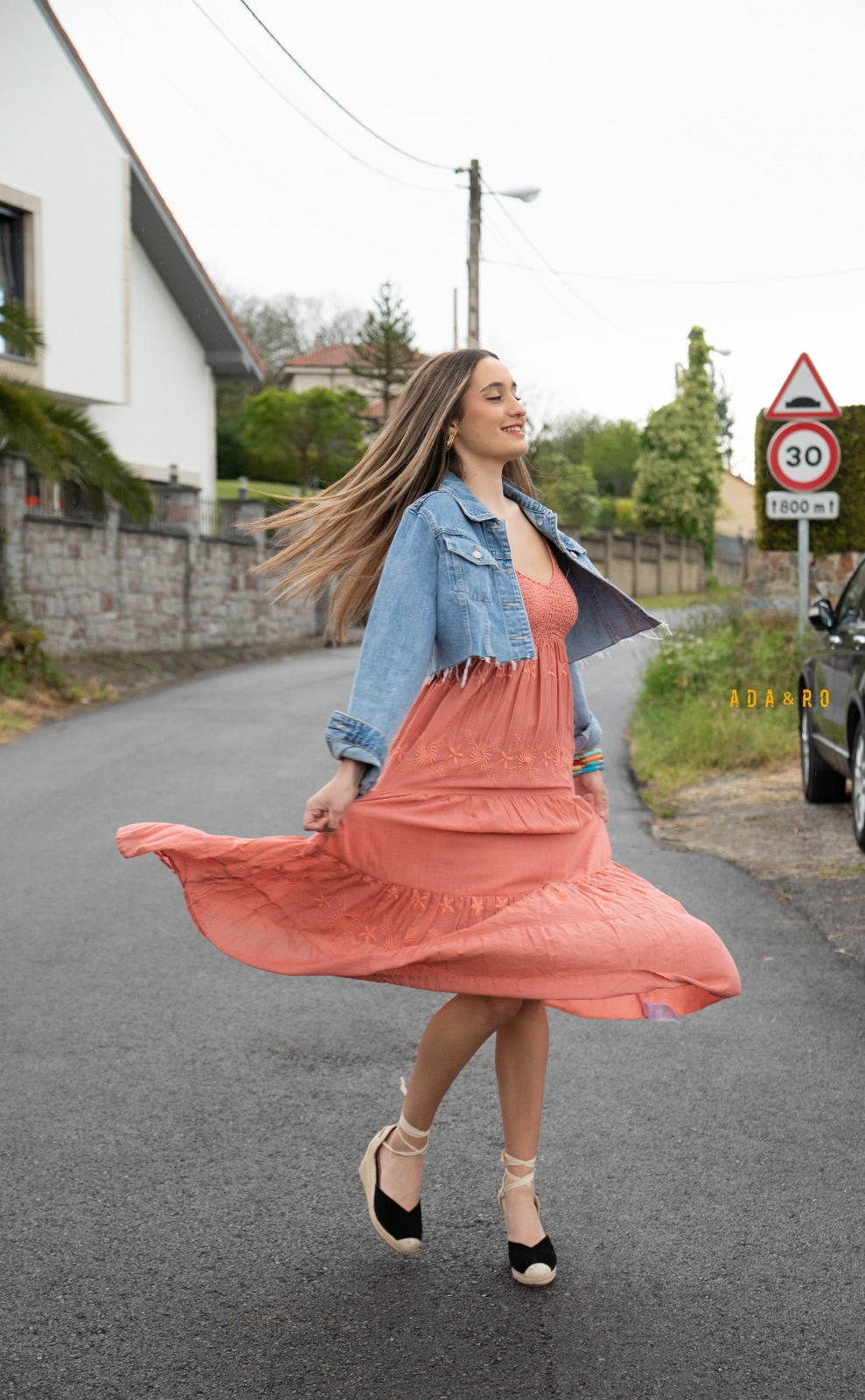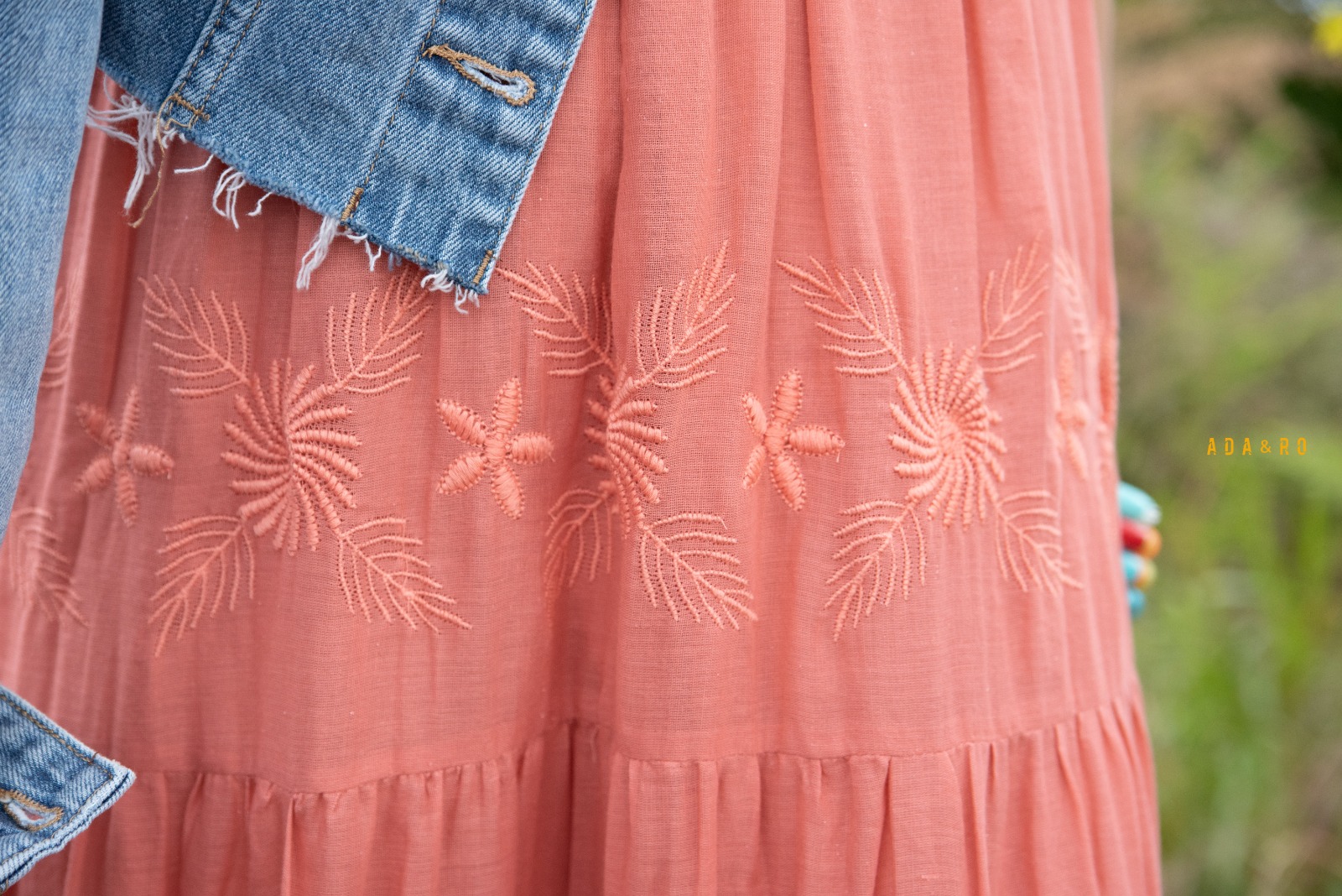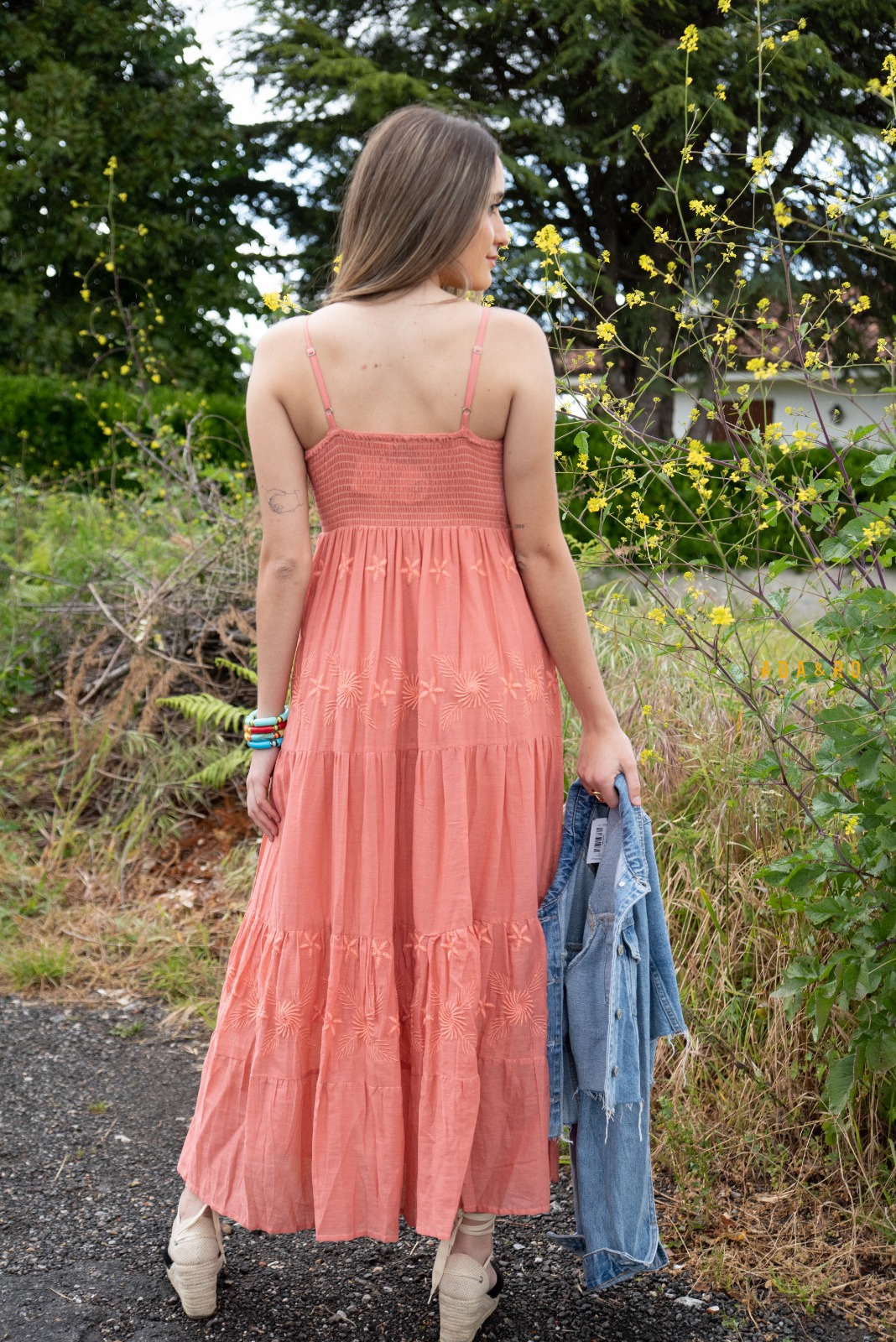 Vestido largo con flores bordadas, con tirantes regulables. escote nido de abeja elástico. Largo 115cm.