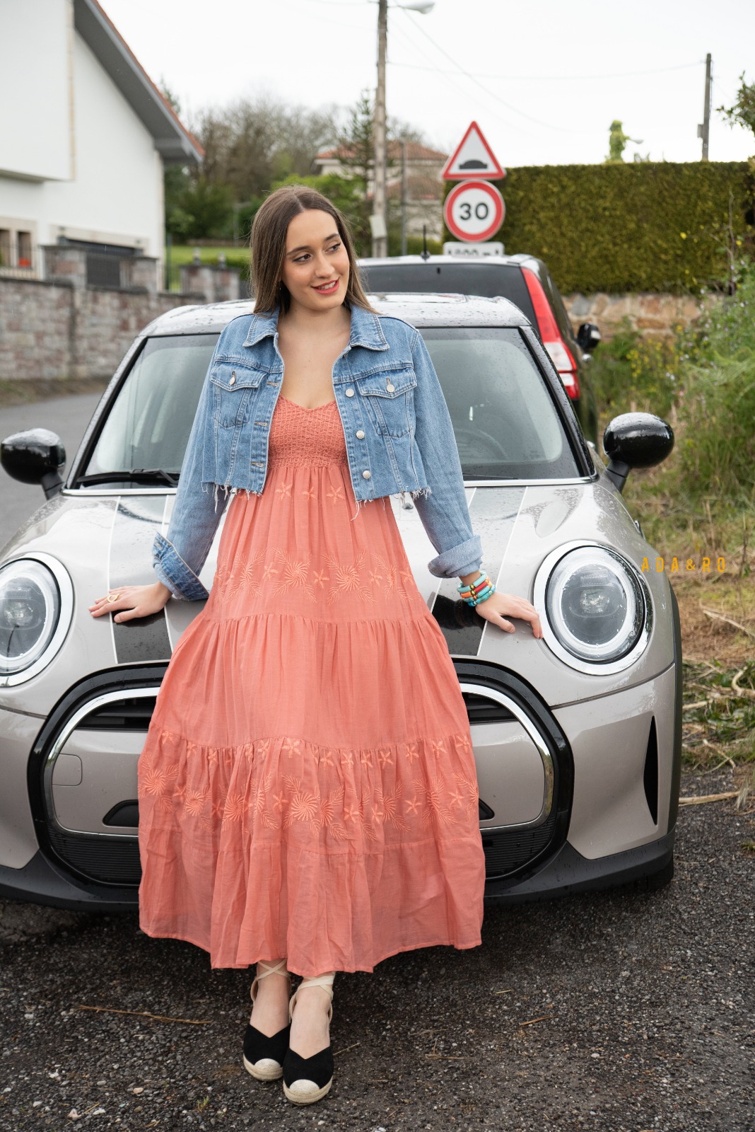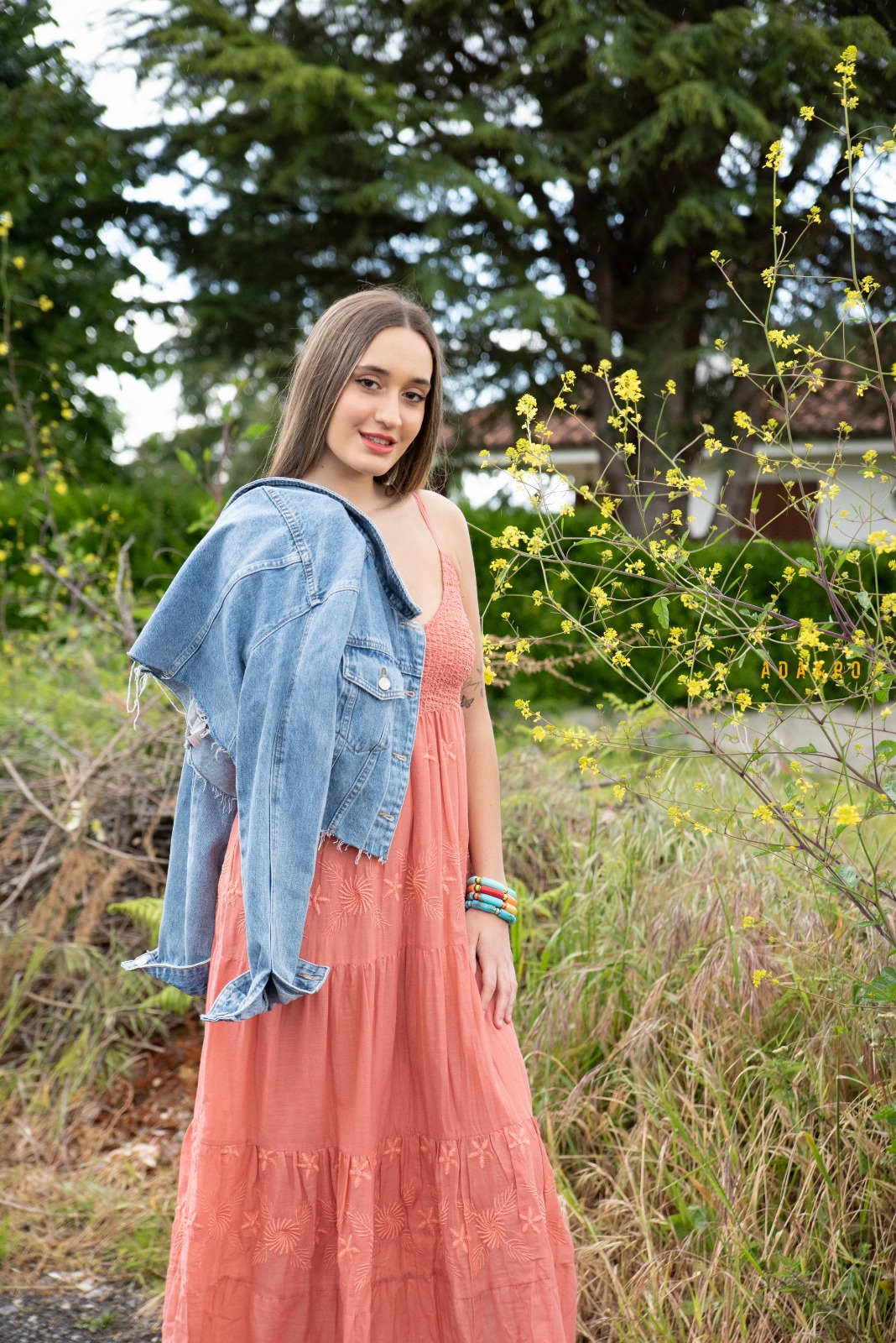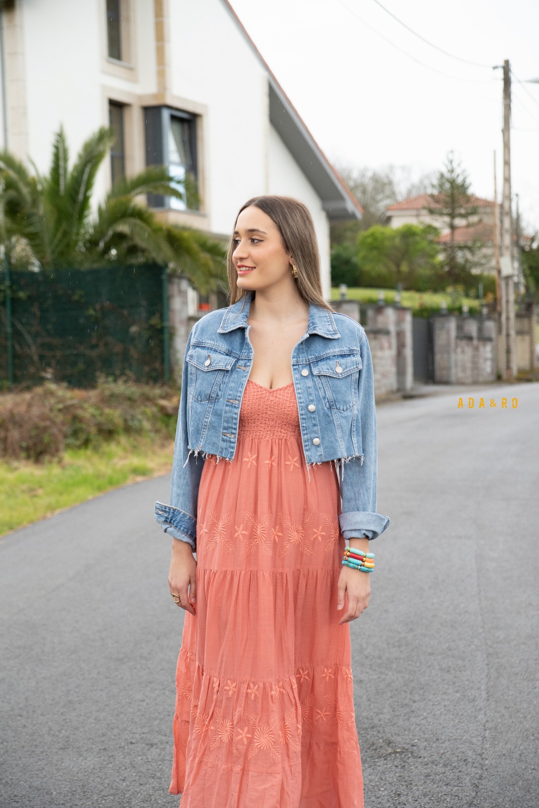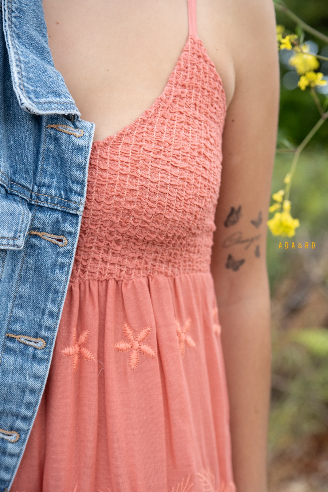 Vestido largo con flores bordadas, con tirantes regulables. escote nido de abeja elástico. Largo 115cm.